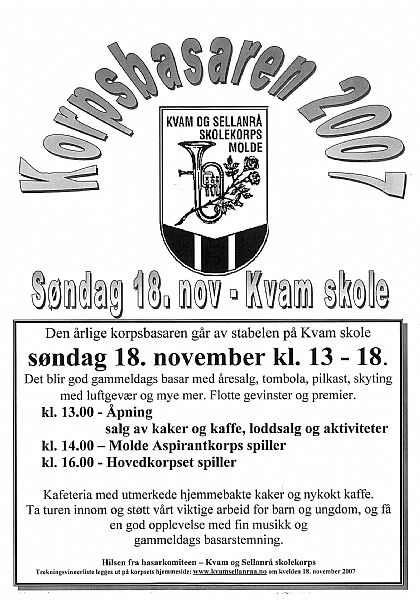 Kvam og Sellanrå Skolekorps sin årlige korpsbasar holdes på Kvam skole søndag 18. november kl. 13.00-18.00. Aspirantkorpset spiller kl. 14.00 og hovedkorpset kl. 16.00.
