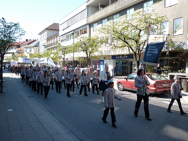 Deretter var det avmarsj for 1.-mai-toget gjennom Storgata til rundkjøringen og tilbake til rådhusplassen, der korpsets spilleoppdrag ble avsluttet med spilling.